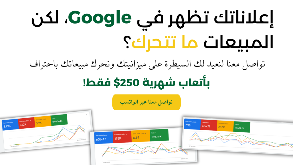 يونيو 25, 2025كيف يمكن لجوجل أدز أن يضاعف مبيعاتك؟ كيف يمكن لجوجل أدز أن يضاعف مبيعات متجرك في السعودية؟ في السوق السعودي اليوم، التنافس على جذب العملاء أصبح أصعب من أي وقت مضى. مئات المتاجر الإلكترونية والمتاجر التقليدية تتسابق يوميًا للظهور أمام...